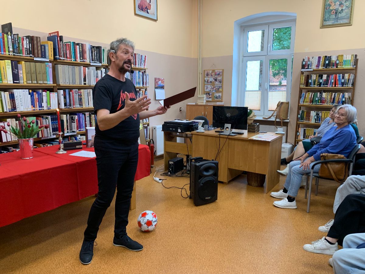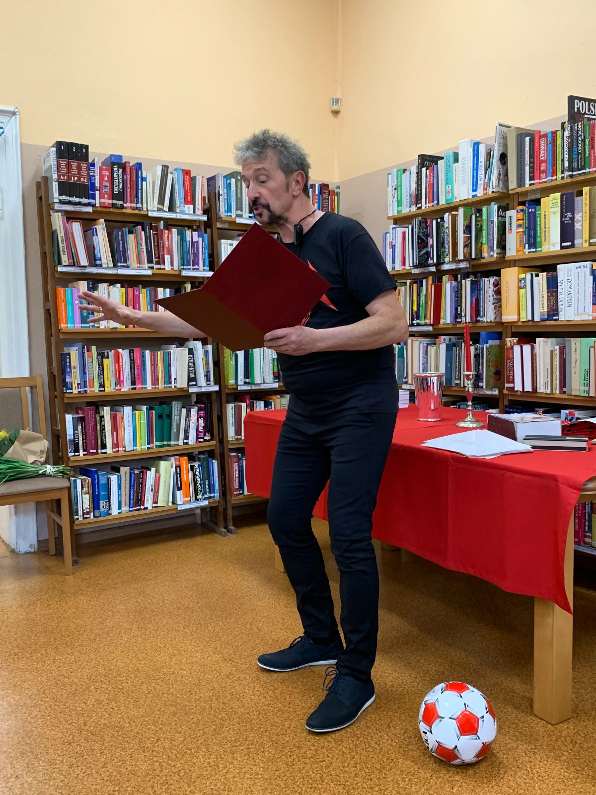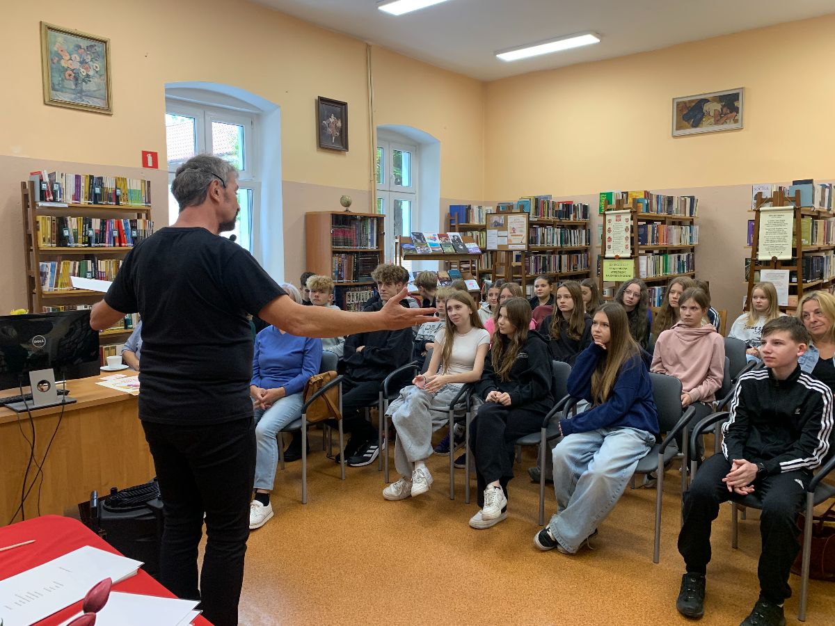 W poniedziałkowe południe, dn. 06.10.2025 r., w murach naszej Biblioteki rozbrzmiała liryka pana Piotra Pilarskiego – aktora i poety, znanego z występów w teatrze jeleniogórskim czy ostrowskim „Nasz Teatr”.