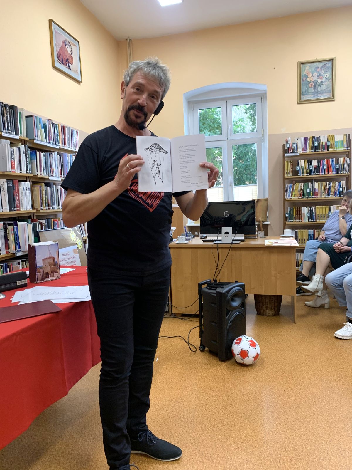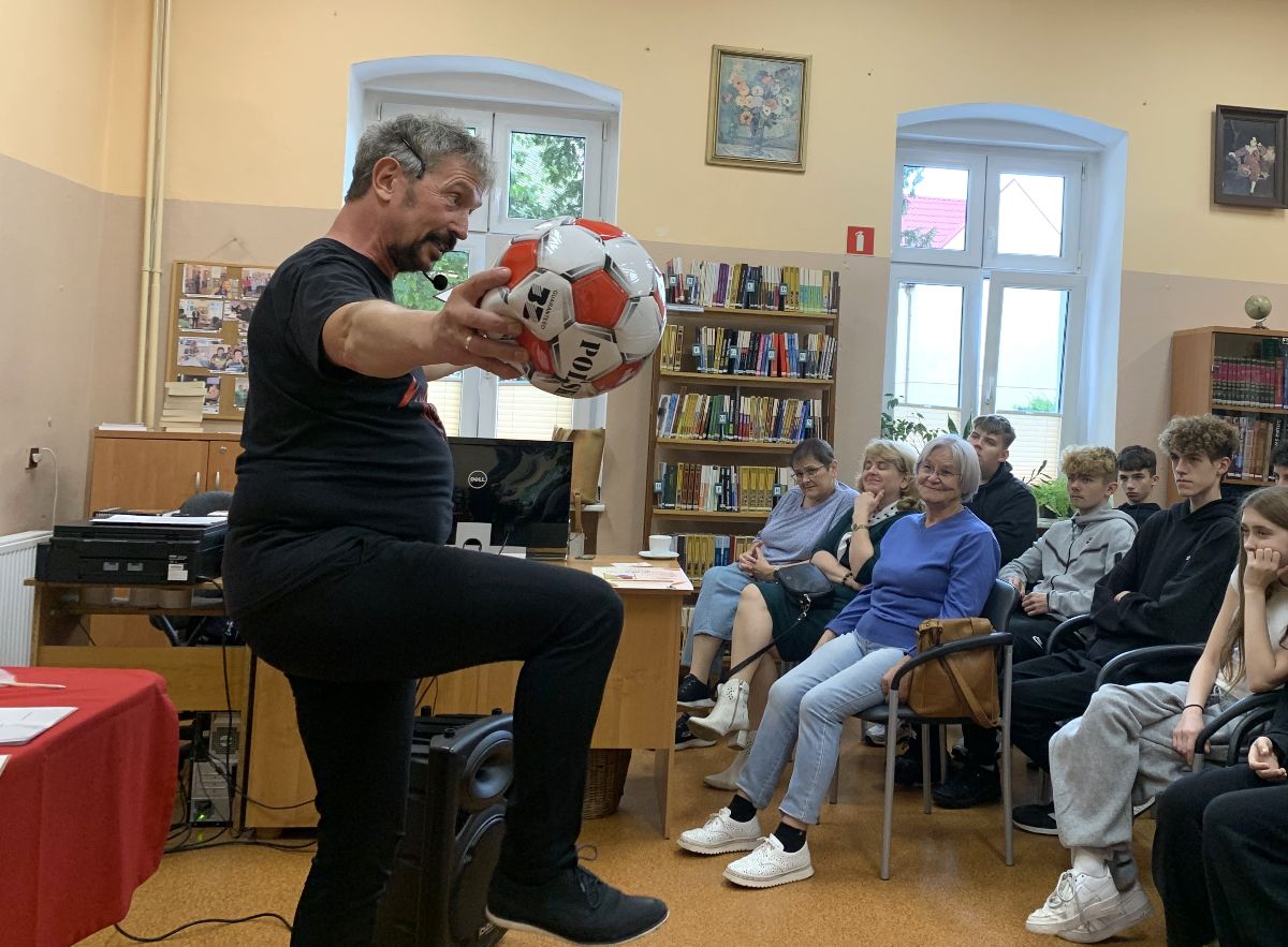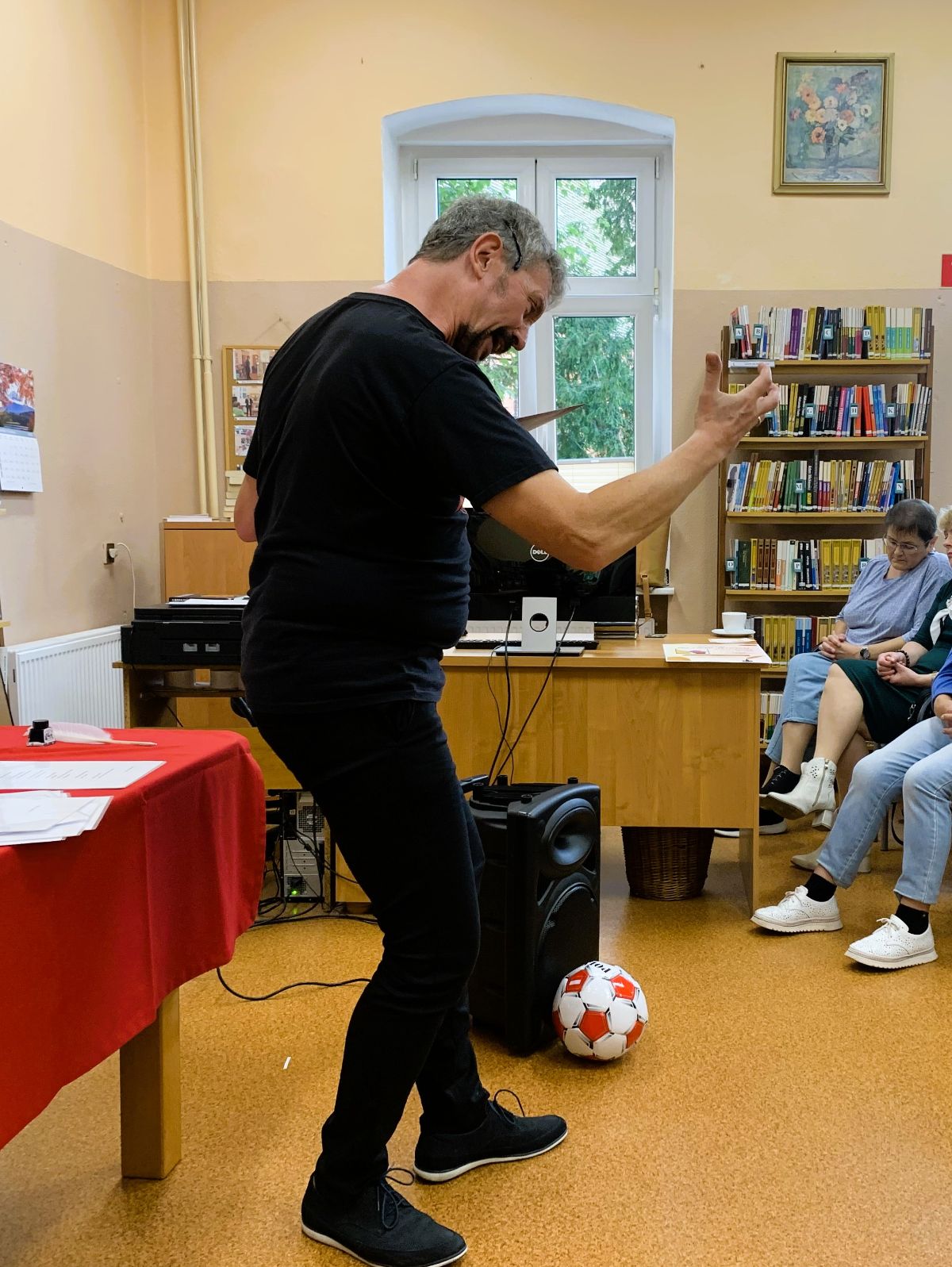W poniedziałkowe południe, dn. 06.10.2025 r., w murach naszej Biblioteki rozbrzmiała liryka pana Piotra Pilarskiego – aktora i poety, znanego z występów w teatrze jeleniogórskim czy ostrowskim „Nasz Teatr”.