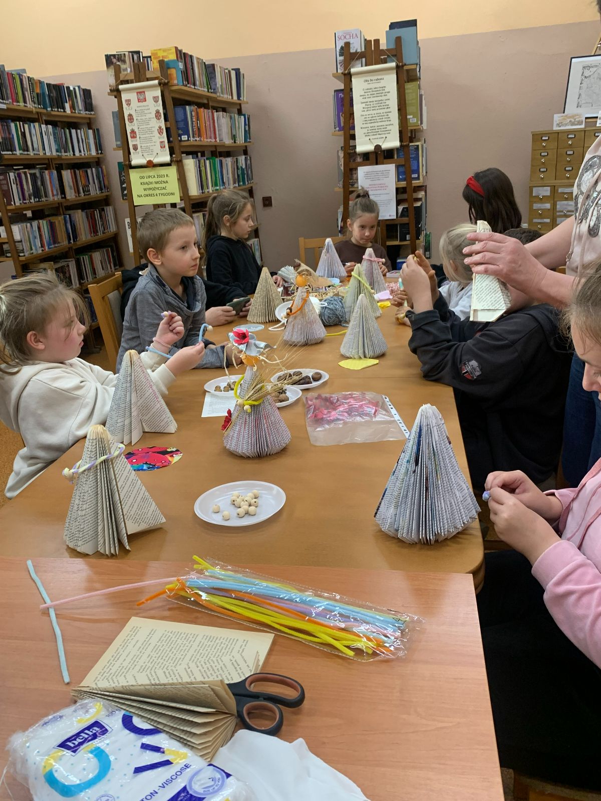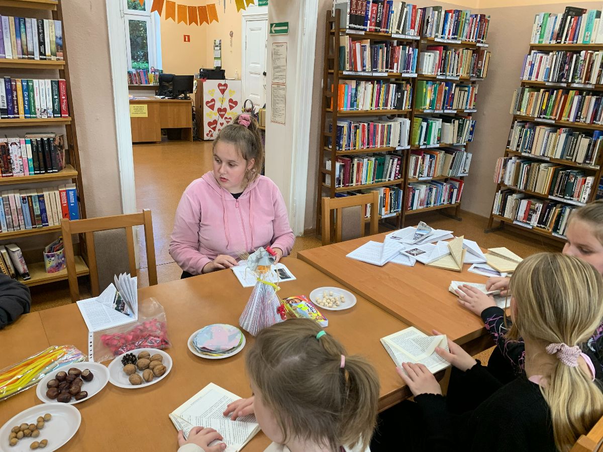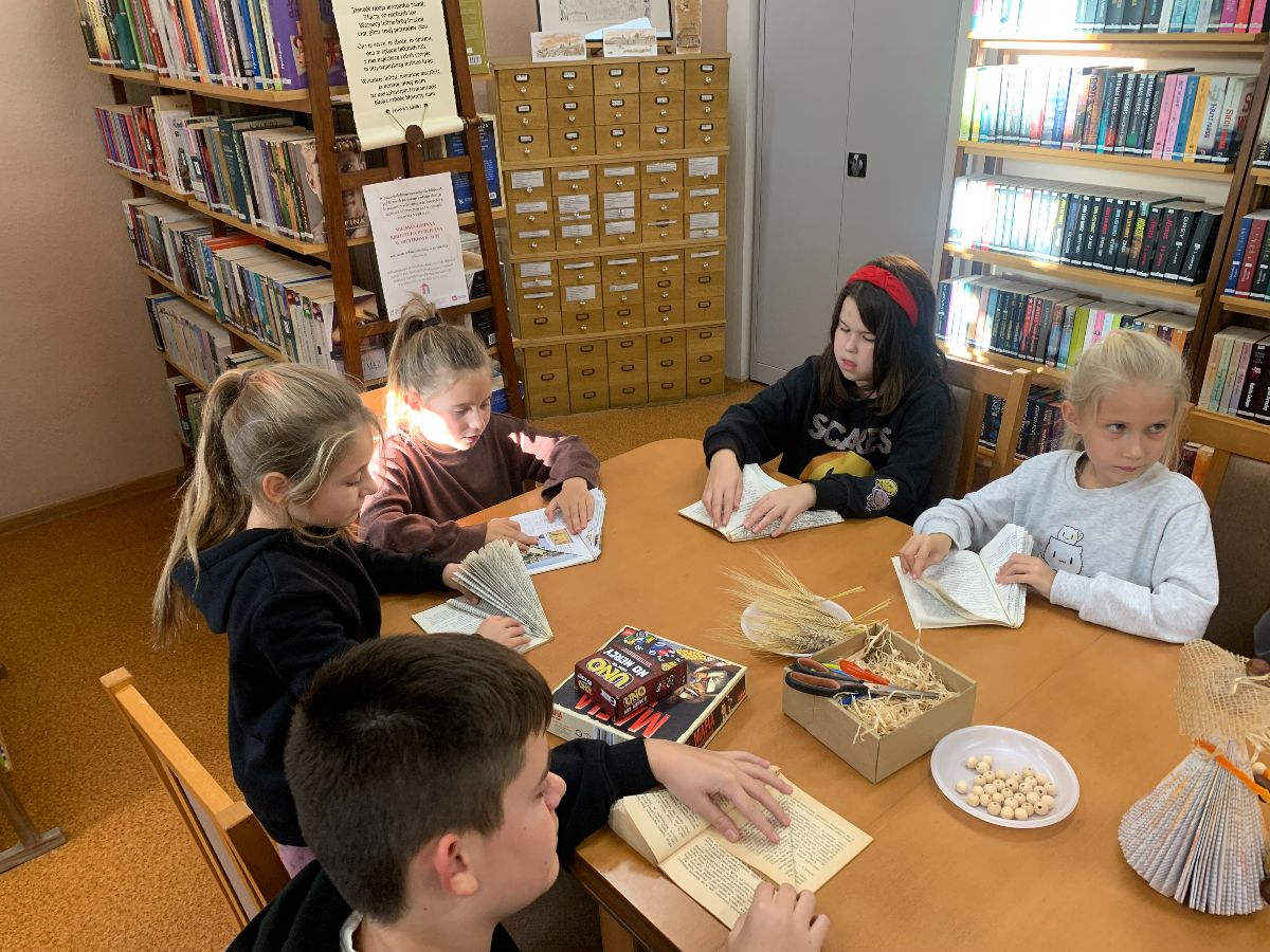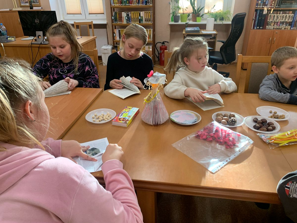 Wprowadzeni w twórczy nastrój, nasi Młodzi Uczestnicy zabrali się do pracy. Zadaniem było własnoręczne wykonanie figurki „Pani Jesieni” z materiałów wtórnych i rękodzielniczych. Każdy z zaangażowaniem urzeczywistniał swoją autorską wizję, nie szczędząc przy tym włóczki ani nie bojąc się ubrudzić pastelami. Choć było to czasochłonne zajęcie, dzieci podołały wyzwaniu, a dumna i wystrojona „Pani Jesień” dosłownie opanowała naszą małą Bibliotekę. Wspięła się po szufladkach katalogu podręcznego, obejrzała księgozbiór w Oddziale dla Dzieci, a nawet przejrzała się w lustrze – bo czyż pozowanie do zdjęć także nie wymaga artystycznego zmysłu? Wykonane prace każdy Uczestnik mógł zabrać ze sobą do domu, przygotowując się na weekend z głową pełną pomysłów.