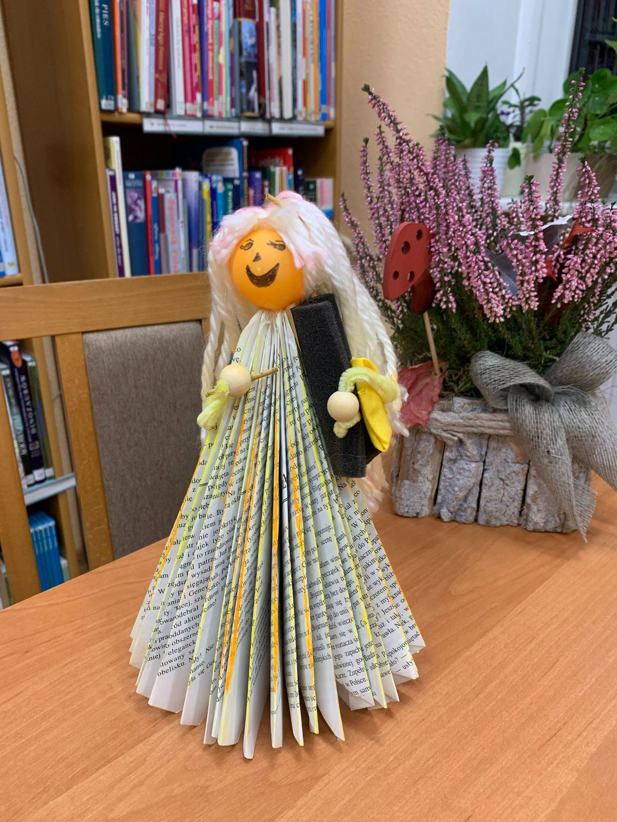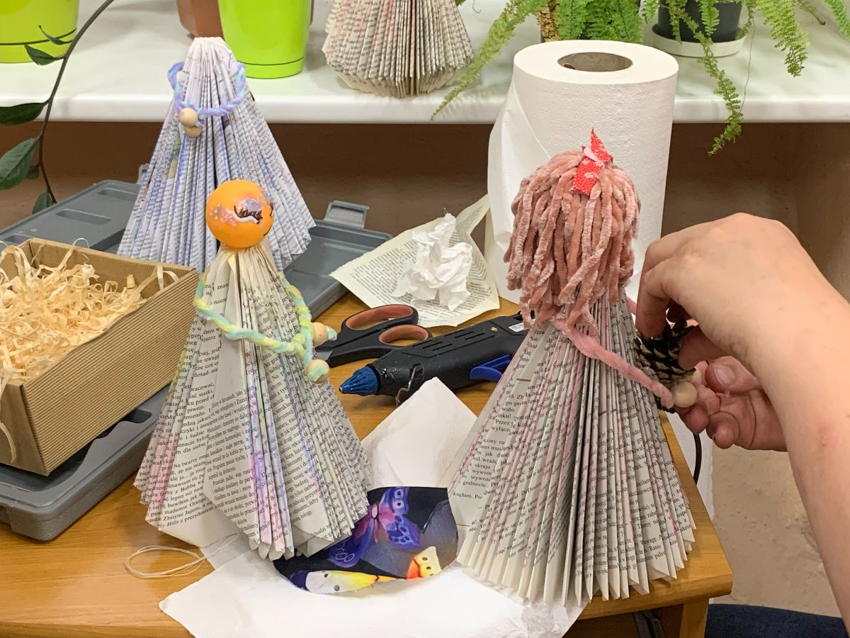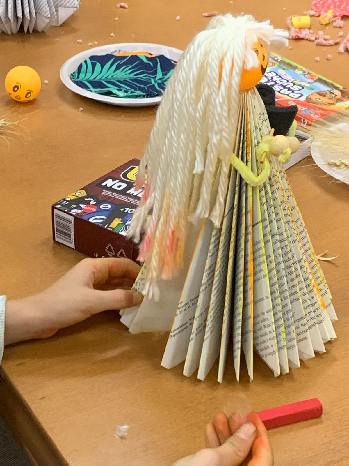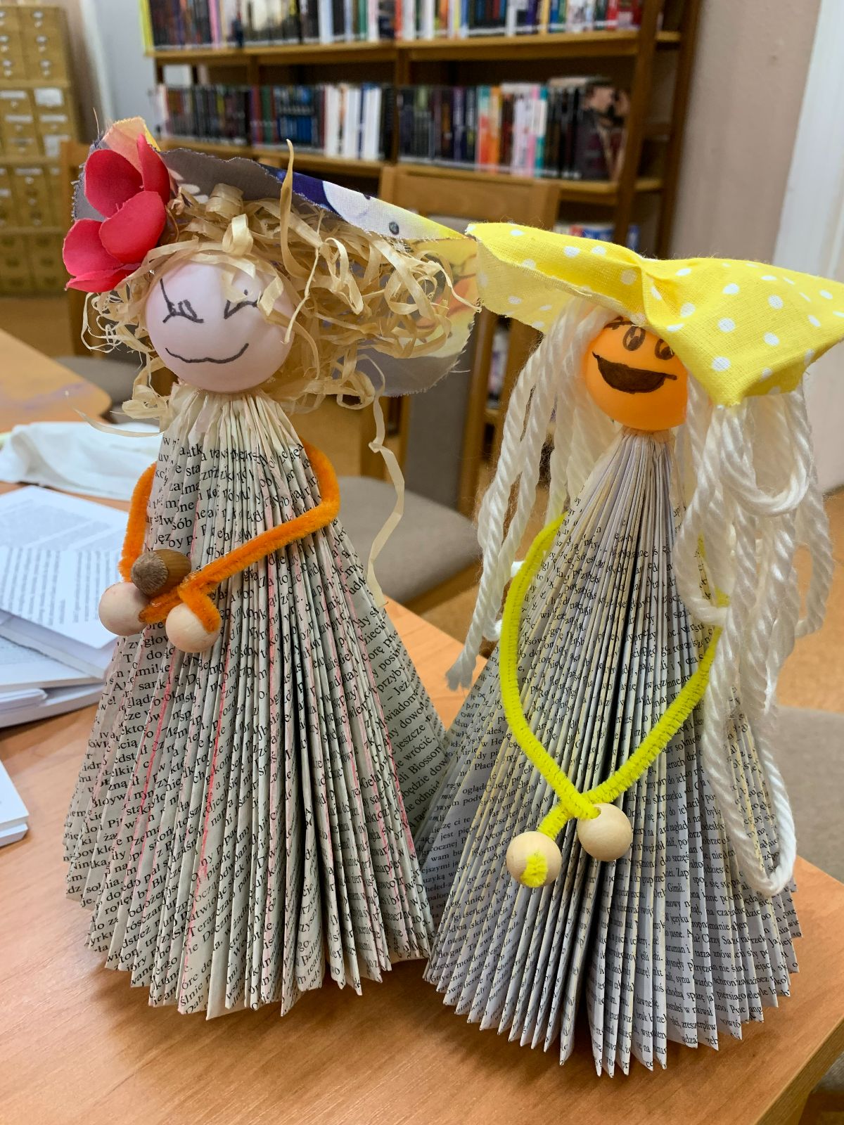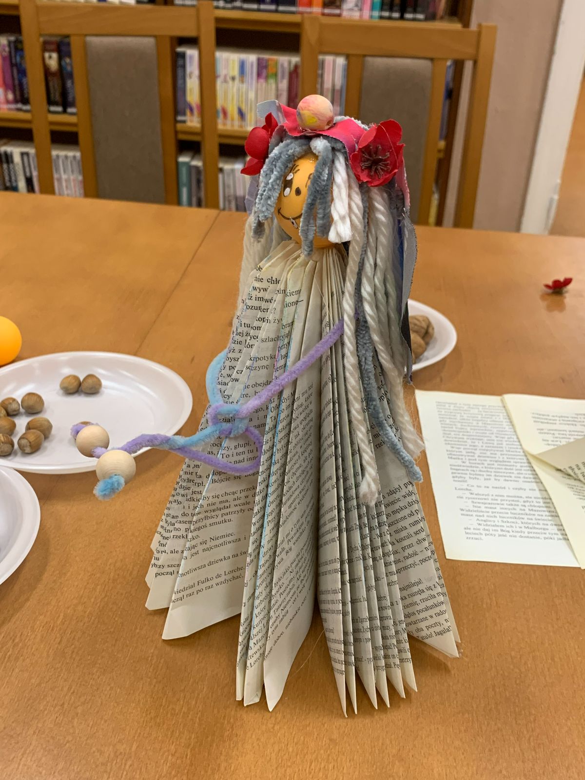 Wprowadzeni w twórczy nastrój, nasi Młodzi Uczestnicy zabrali się do pracy. Zadaniem było własnoręczne wykonanie figurki „Pani Jesieni” z materiałów wtórnych i rękodzielniczych. Każdy z zaangażowaniem urzeczywistniał swoją autorską wizję, nie szczędząc przy tym włóczki ani nie bojąc się ubrudzić pastelami. Choć było to czasochłonne zajęcie, dzieci podołały wyzwaniu, a dumna i wystrojona „Pani Jesień” dosłownie opanowała naszą małą Bibliotekę. Wspięła się po szufladkach katalogu podręcznego, obejrzała księgozbiór w Oddziale dla Dzieci, a nawet przejrzała się w lustrze – bo czyż pozowanie do zdjęć także nie wymaga artystycznego zmysłu? Wykonane prace każdy Uczestnik mógł zabrać ze sobą do domu, przygotowując się na weekend z głową pełną pomysłów.