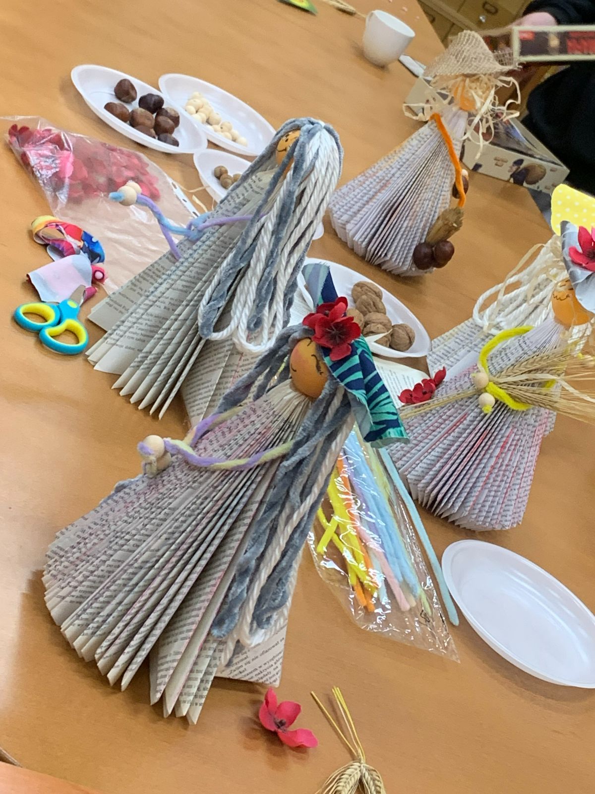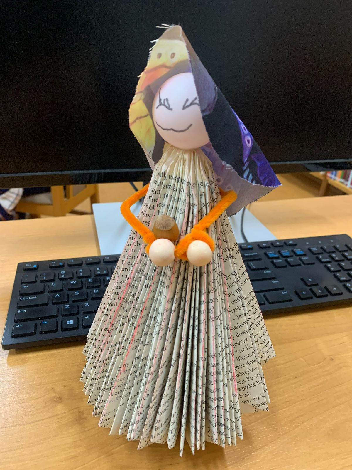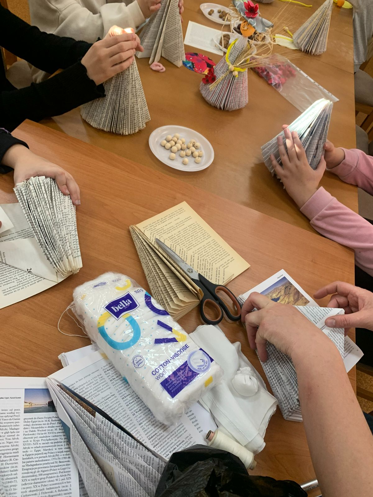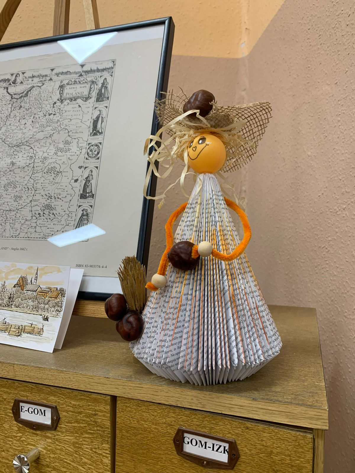 Wprowadzeni w twórczy nastrój, nasi Młodzi Uczestnicy zabrali się do pracy. Zadaniem było własnoręczne wykonanie figurki „Pani Jesieni” z materiałów wtórnych i rękodzielniczych. Każdy z zaangażowaniem urzeczywistniał swoją autorską wizję, nie szczędząc przy tym włóczki ani nie bojąc się ubrudzić pastelami. Choć było to czasochłonne zajęcie, dzieci podołały wyzwaniu, a dumna i wystrojona „Pani Jesień” dosłownie opanowała naszą małą Bibliotekę. Wspięła się po szufladkach katalogu podręcznego, obejrzała księgozbiór w Oddziale dla Dzieci, a nawet przejrzała się w lustrze – bo czyż pozowanie do zdjęć także nie wymaga artystycznego zmysłu? Wykonane prace każdy Uczestnik mógł zabrać ze sobą do domu, przygotowując się na weekend z głową pełną pomysłów.