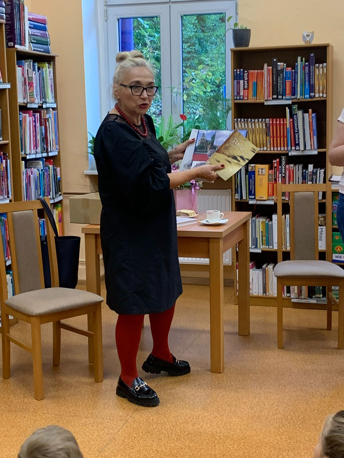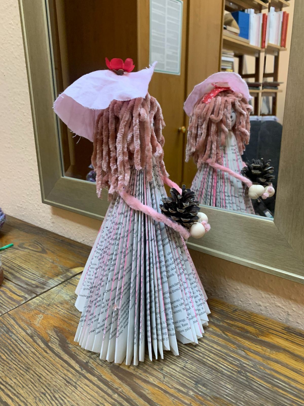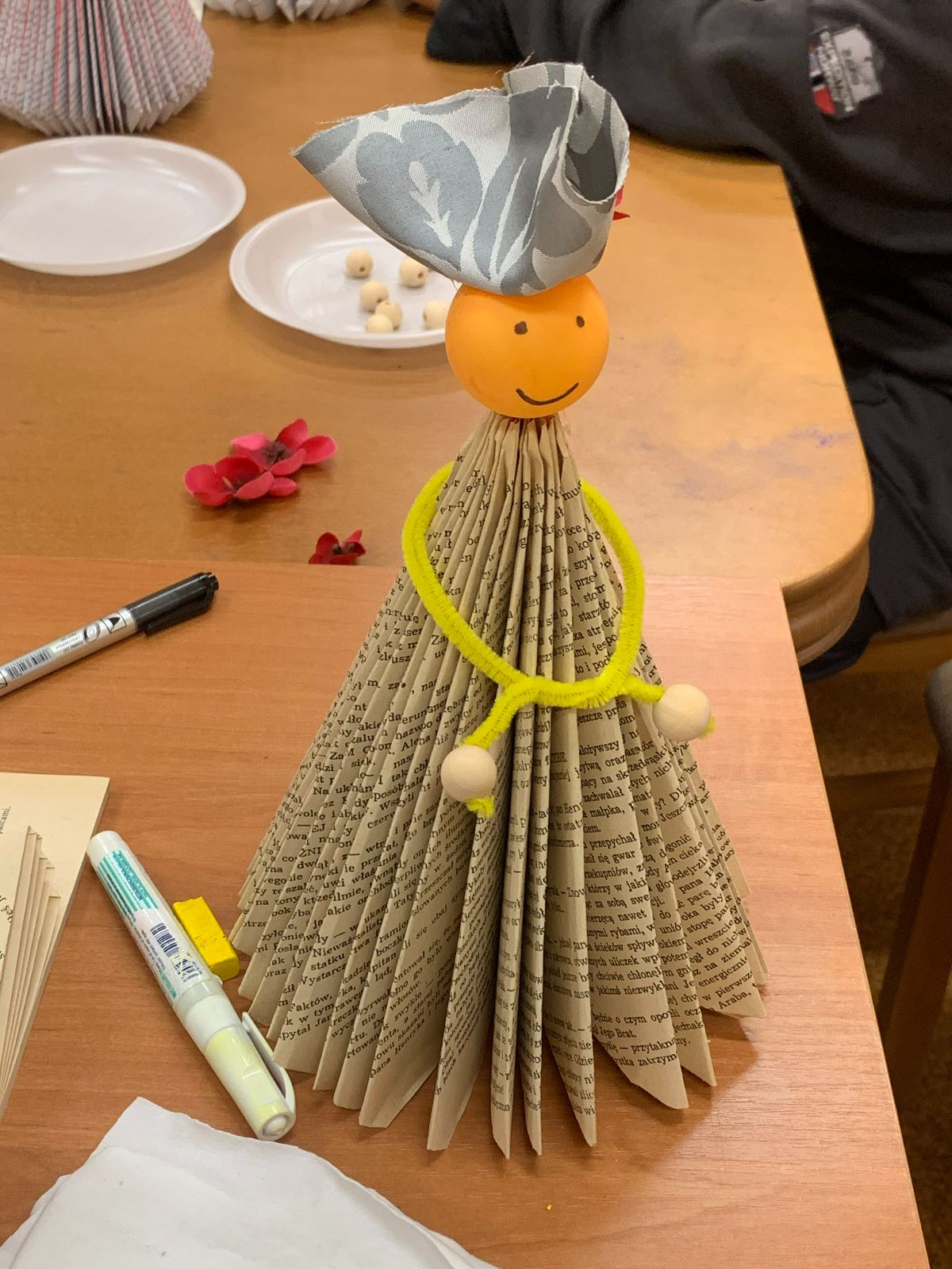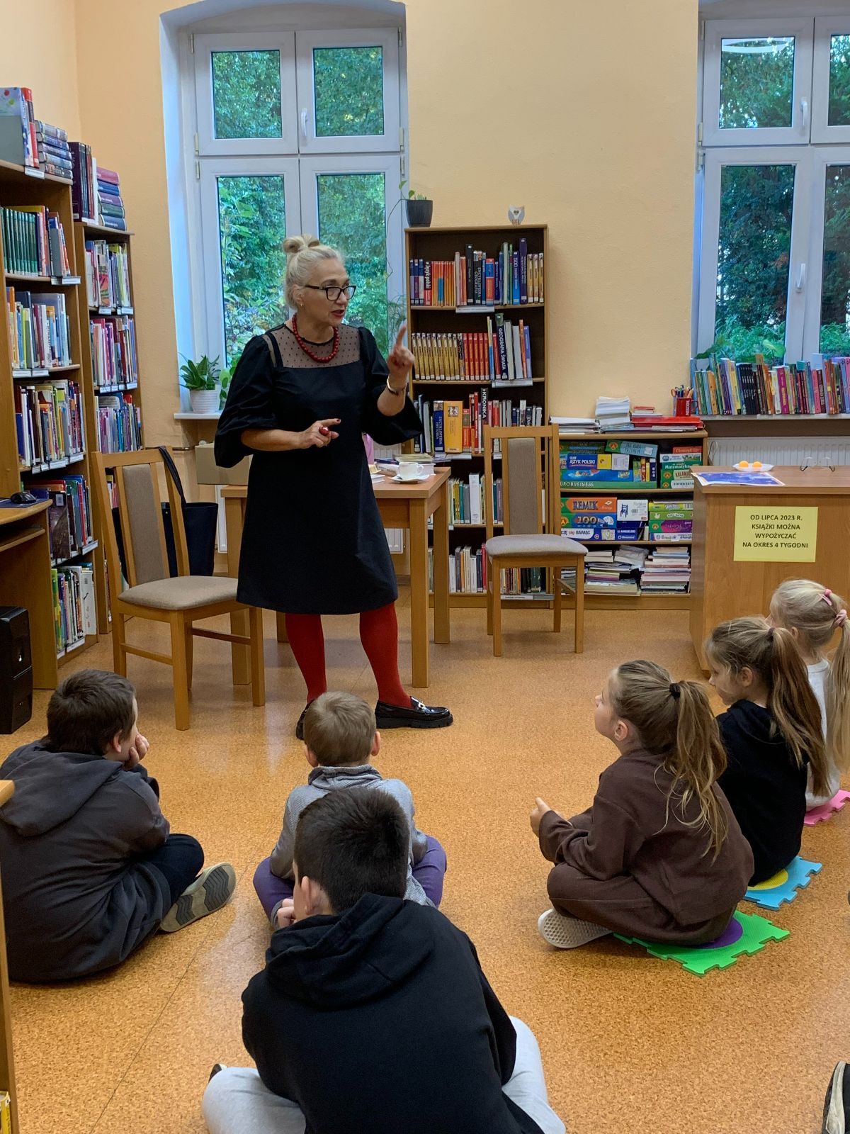 Wprowadzeni w twórczy nastrój, nasi Młodzi Uczestnicy zabrali się do pracy. Zadaniem było własnoręczne wykonanie figurki „Pani Jesieni” z materiałów wtórnych i rękodzielniczych. Każdy z zaangażowaniem urzeczywistniał swoją autorską wizję, nie szczędząc przy tym włóczki ani nie bojąc się ubrudzić pastelami. Choć było to czasochłonne zajęcie, dzieci podołały wyzwaniu, a dumna i wystrojona „Pani Jesień” dosłownie opanowała naszą małą Bibliotekę. Wspięła się po szufladkach katalogu podręcznego, obejrzała księgozbiór w Oddziale dla Dzieci, a nawet przejrzała się w lustrze – bo czyż pozowanie do zdjęć także nie wymaga artystycznego zmysłu? Wykonane prace każdy Uczestnik mógł zabrać ze sobą do domu, przygotowując się na weekend z głową pełną pomysłów.