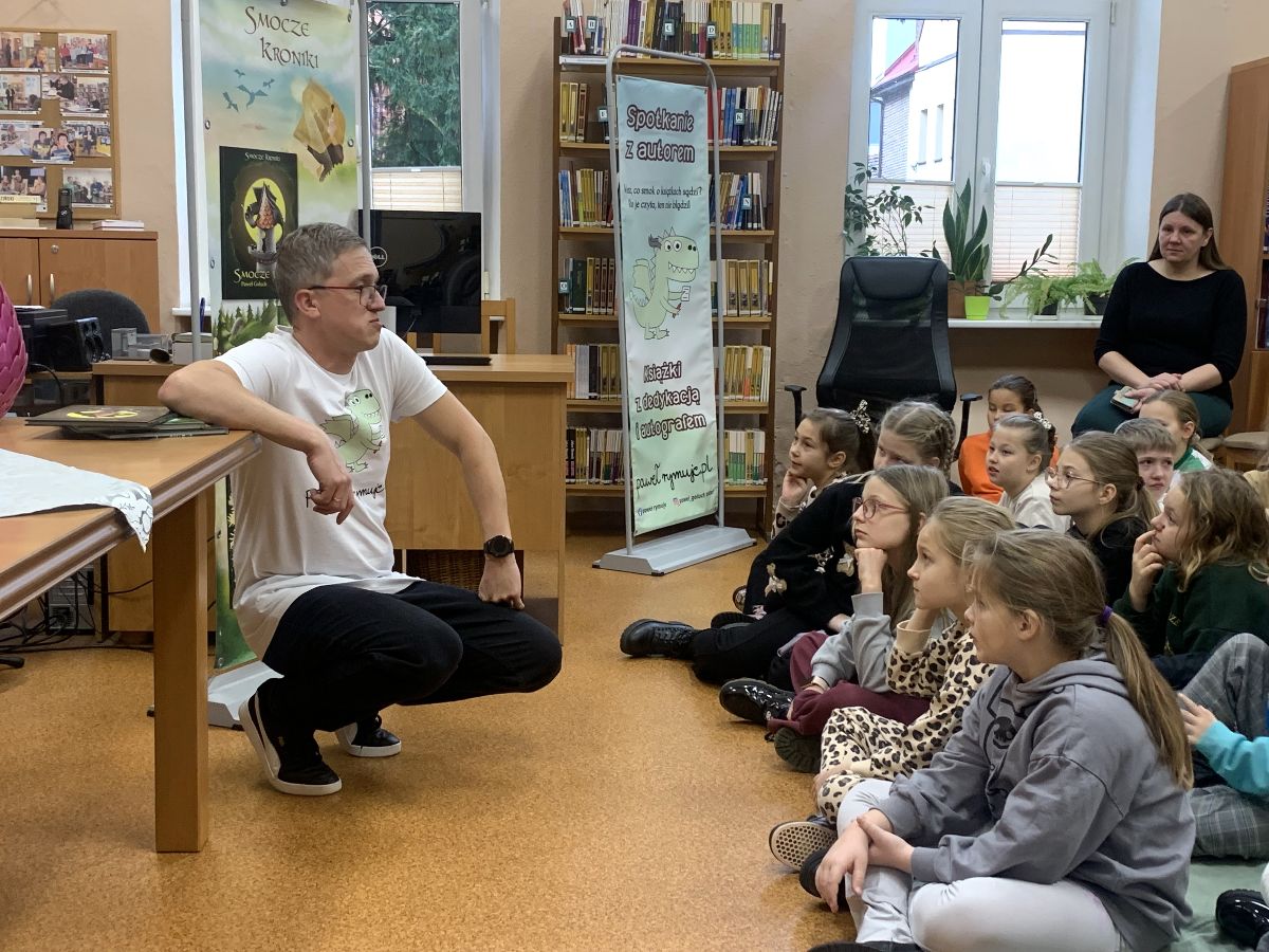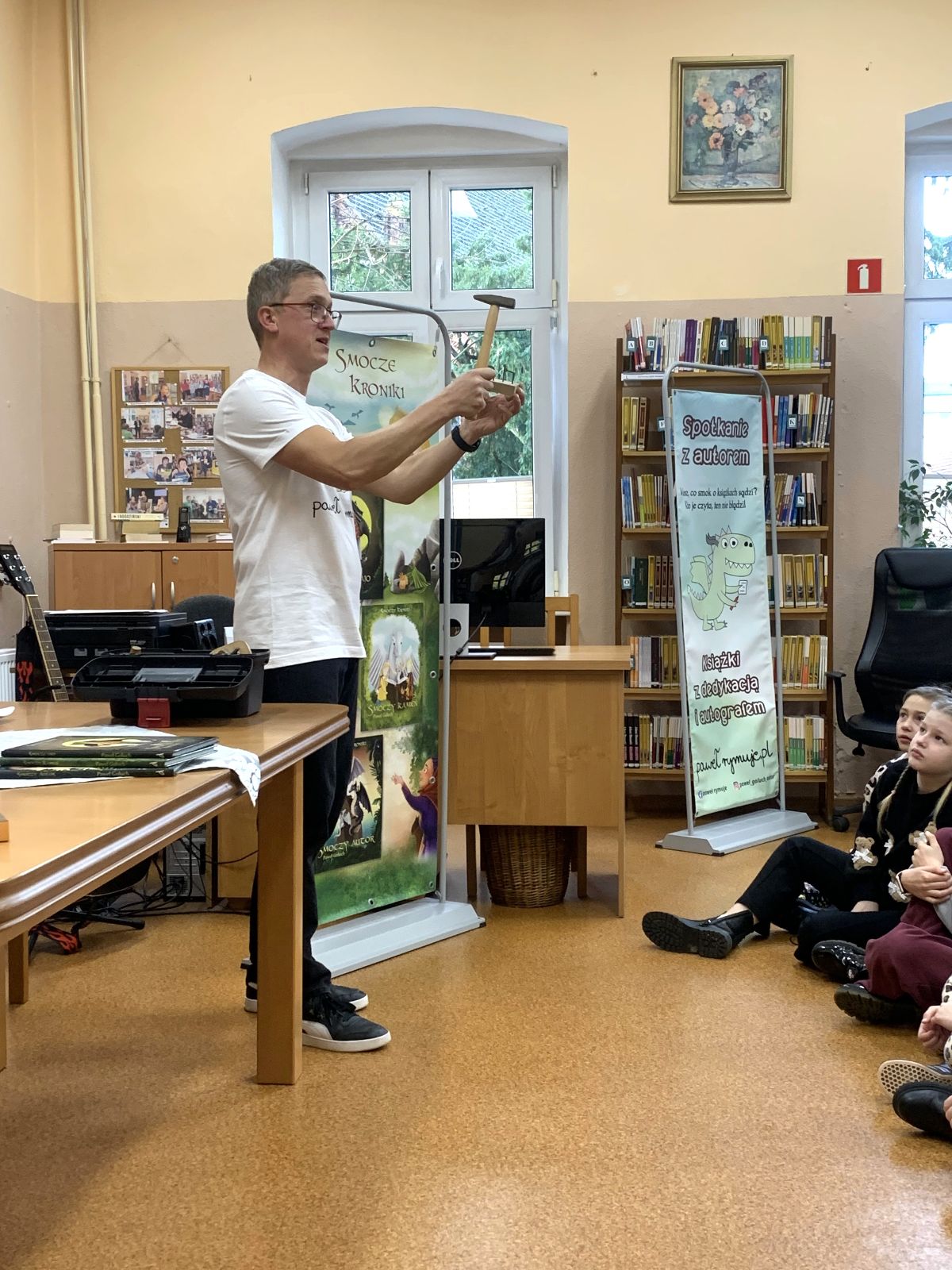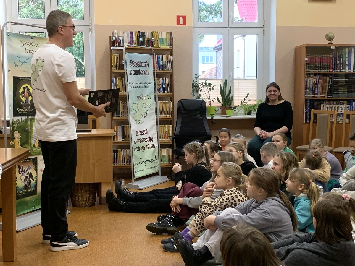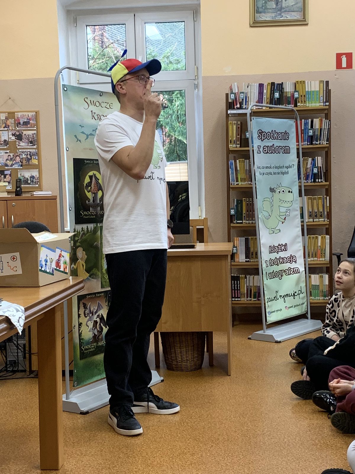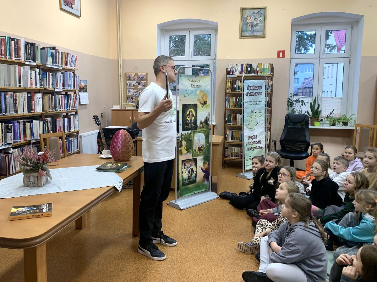 W środowy poranek, dn. 19 listopada 2025 r., gościliśmy w naszej Bibliotece p. Pawła Gołucha – autora kilkudziesięciu wierszy dla dzieci, tekstów piosenek oraz prezentujących szlachetne wartości wierszowanych książek z serii „Smocze kroniki”.
