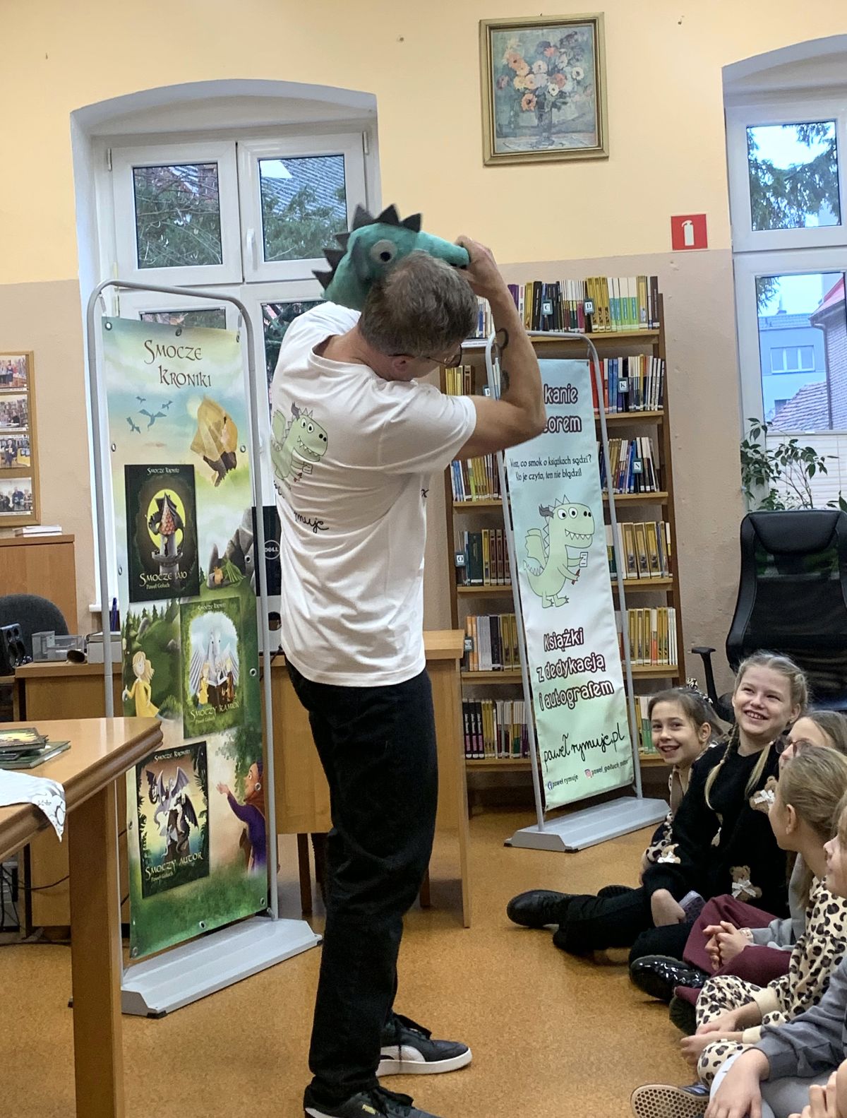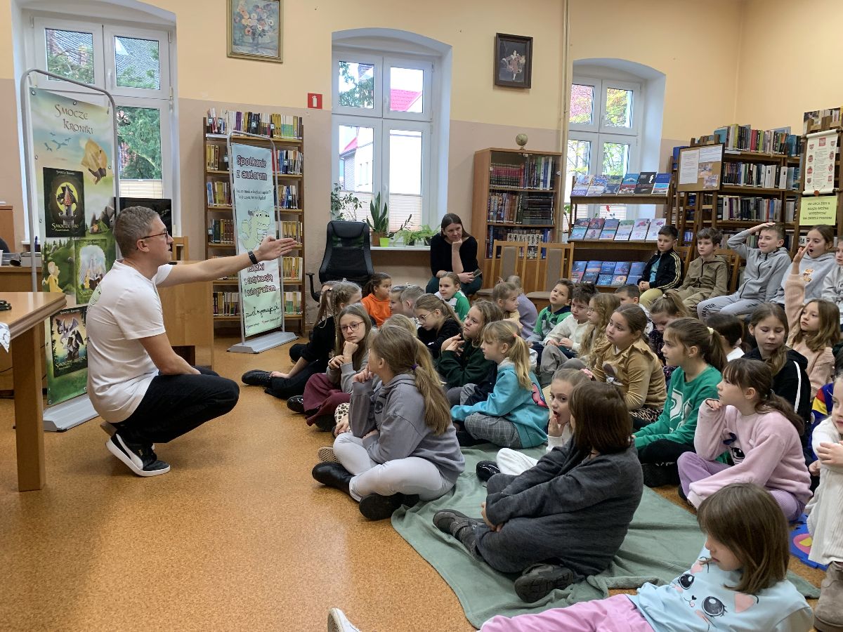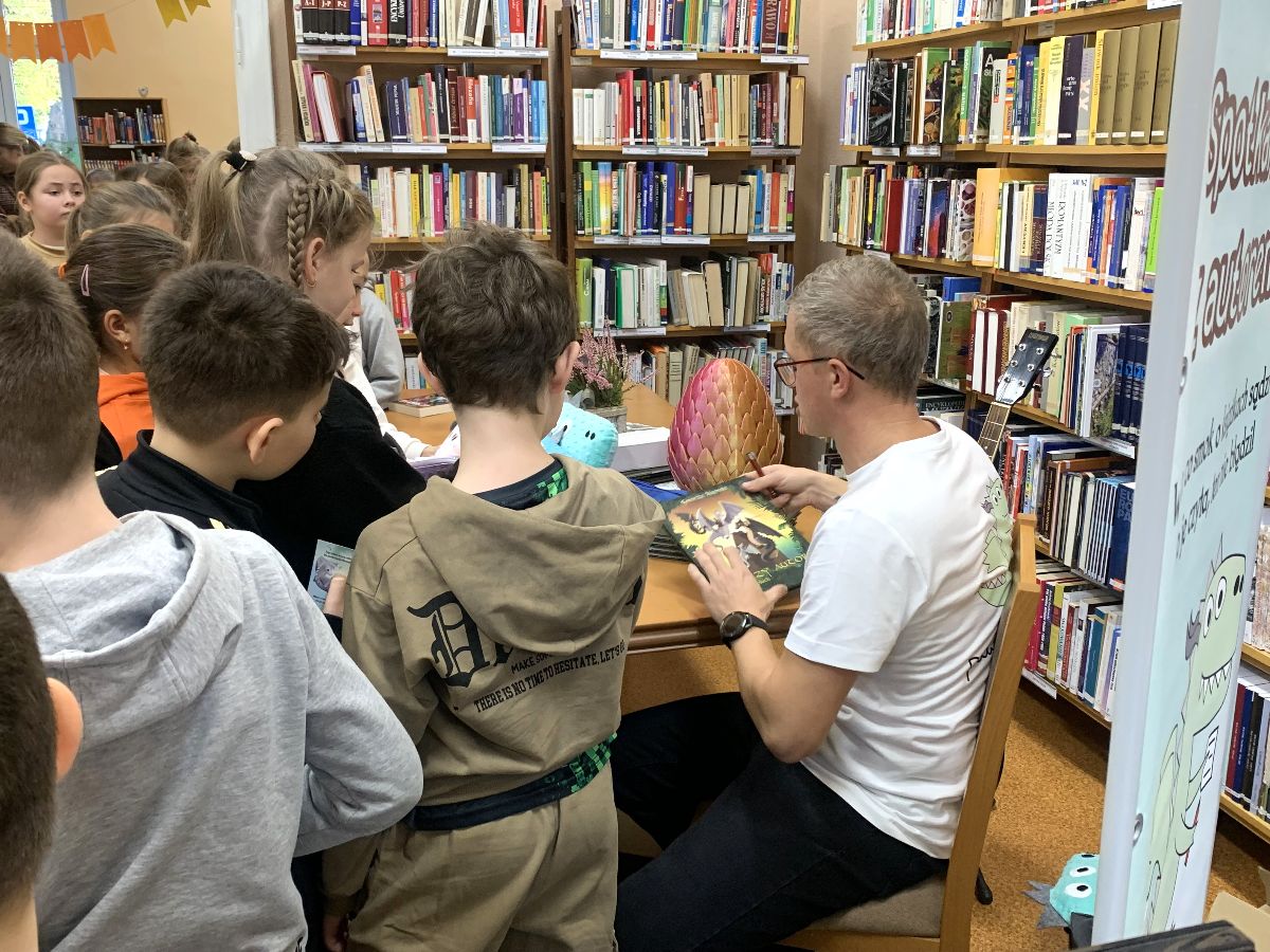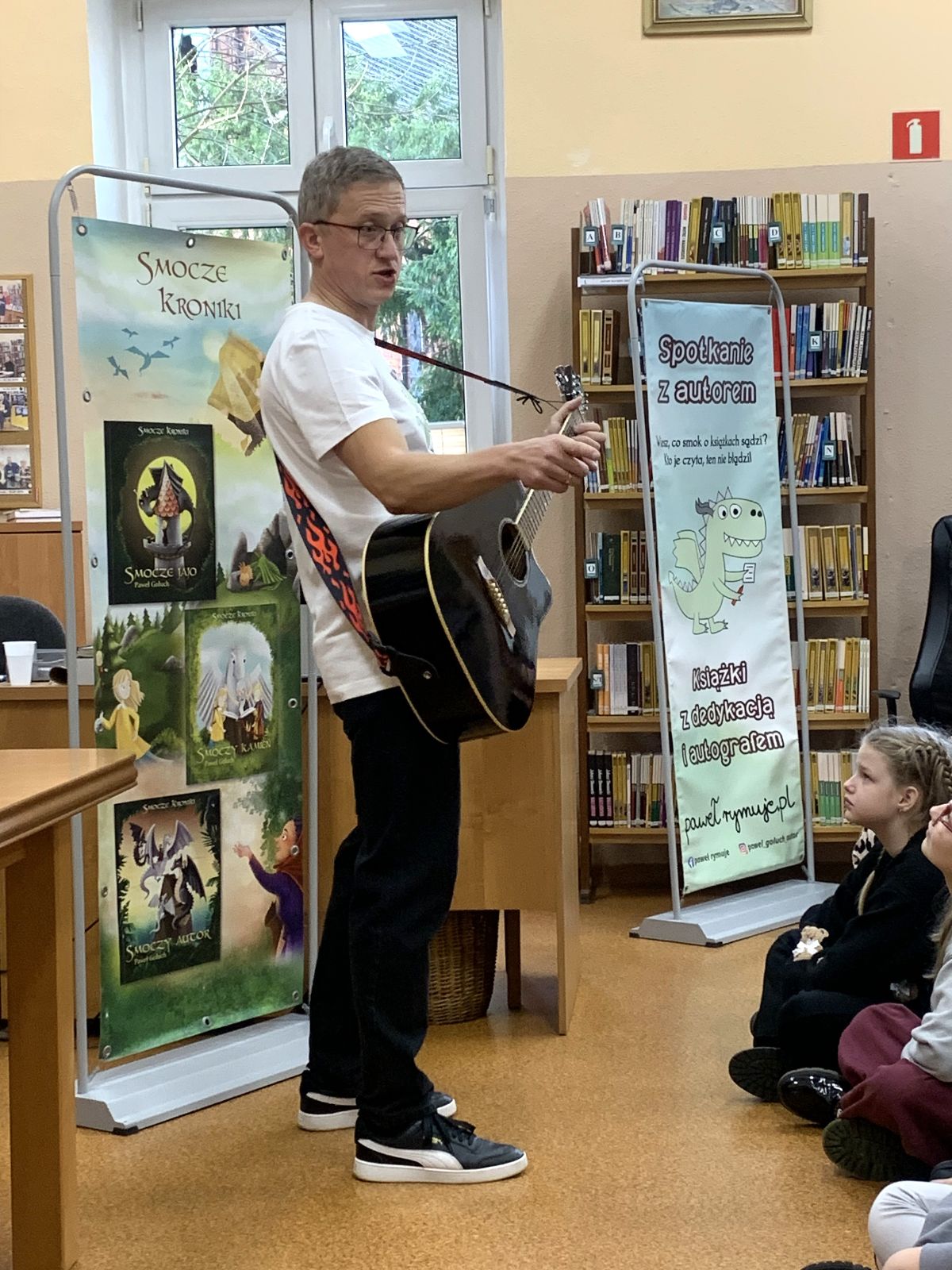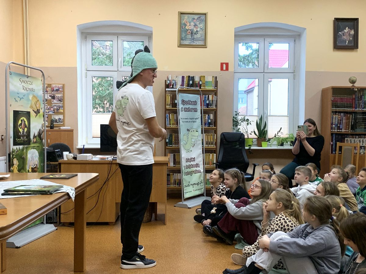 W środowy poranek, dn. 19 listopada 2025 r., gościliśmy w naszej Bibliotece p. Pawła Gołucha – autora kilkudziesięciu wierszy dla dzieci, tekstów piosenek oraz prezentujących szlachetne wartości wierszowanych książek z serii „Smocze kroniki”.