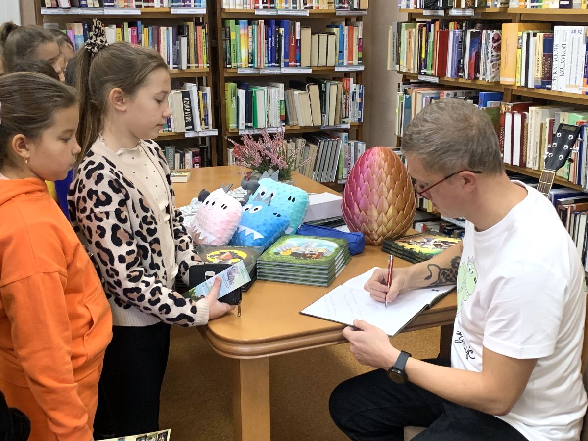 Po spotkaniu chętni mogli zakupić książeczki z autografem. Również i nasza Biblioteka posiada już serię „Smocze Kroniki” – zapraszamy do wypożyczania tomików w Oddziale dla Dzieci w Mieszkowicach.