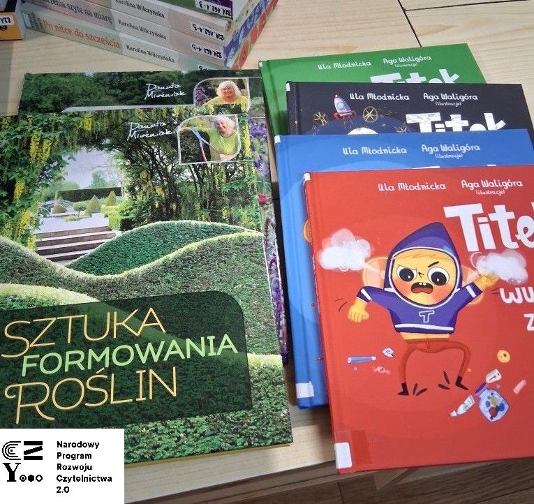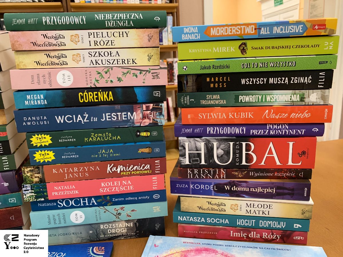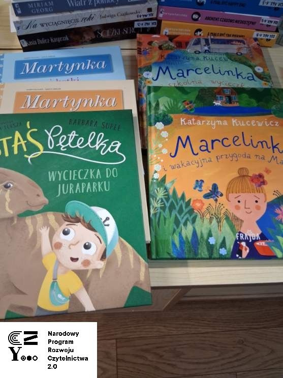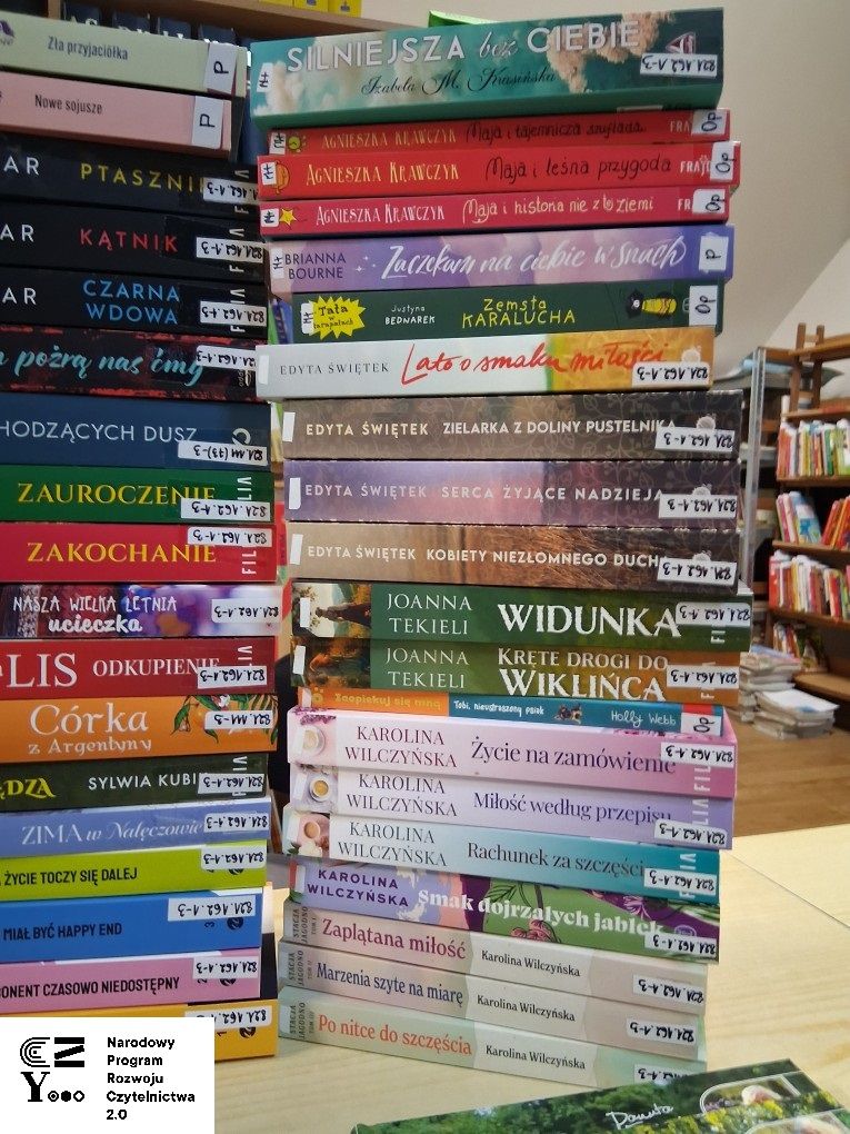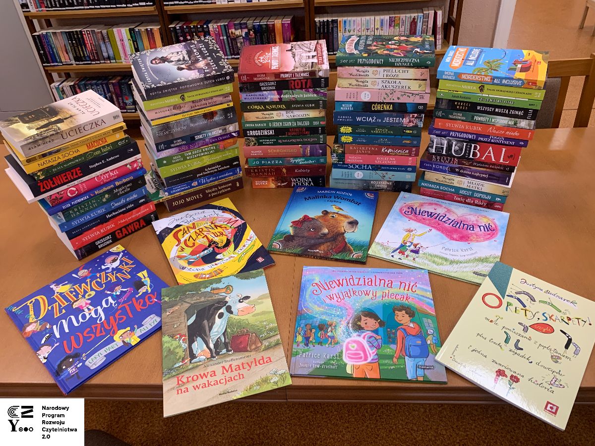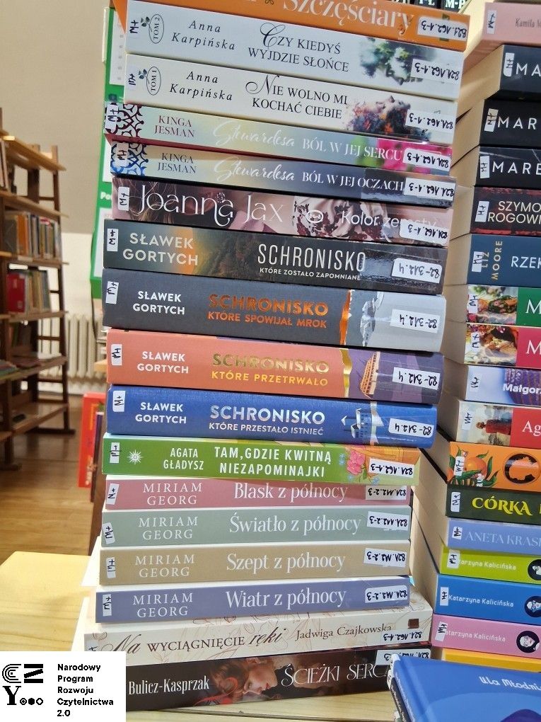 „Dofinansowano ze środków finansowych Ministra Kultury i Dziedzictwa Narodowego w ramach realizacji Narodowego Programu Rozwoju Czytelnictwa 2.0 na lata 2021-2025” oraz „Dofinansowania dla bibliotek publicznych na zakup nowości wydawniczych oraz usługi zdalnego dostępu do książek w formatach e-booków i/lub audiobooków i/lub synchrobooków – Priorytet 1, Kierunek interwencji 1.1. w ramach NPRCz 2.0”.